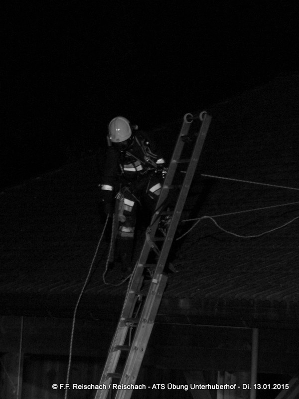 Bei dieser Übung wurden zwei Abschnitte gebildet. Der erste Atemschutztrupp hatte die Aufgabe auf das Dach des Wirtschaftsgebäude aufzusteigen, wobei hier besonderes Augenmerk auf die Absturzsicherung gelegt wurde. Anschließend galt es das Dach mittels der Rettungssäge zu öffnen.